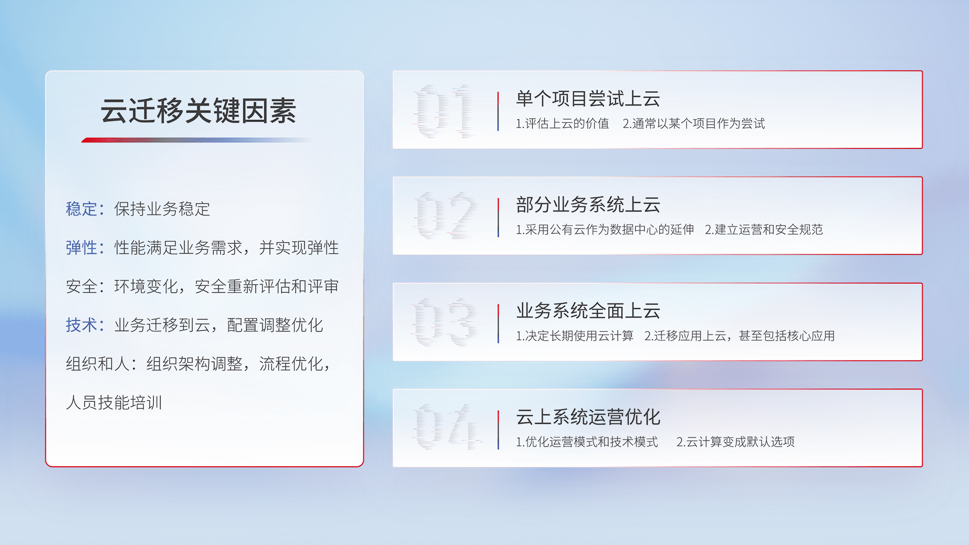 结合实际业务,,,从规划设计、、云平台选型、、、云原生改造、、、数据迁移、、、、集成交付,,,迁移全过程为客户识别最佳上云路径,,做好风险识别管理,,设计网络架构、、身份权限、、安全审计合规、、、、操作审计、、、日志审计、、监控告警策略、、多站点容灾设计等,,,对云上基础设施进行整体规划,,,,提升IT治理水平,,,以满足弹性、、高可用、、高性能的需求。。。。